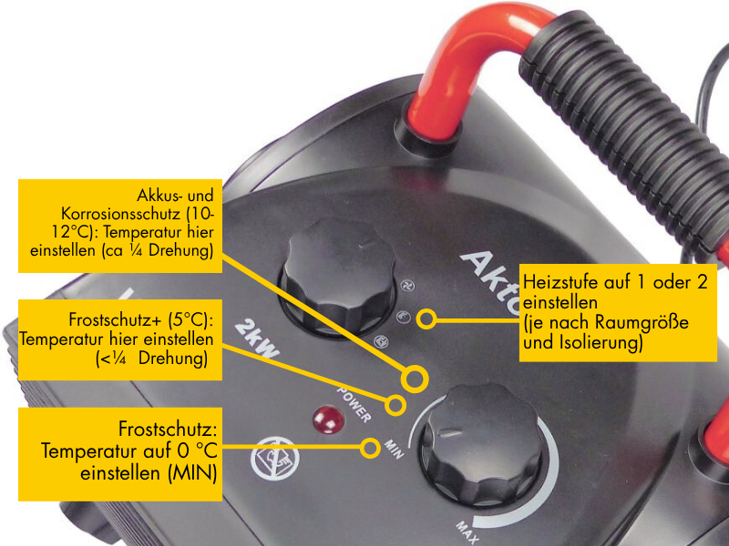 - Temperature setting (right-hand rotary knob): The temperature should either be set to the minimum value (0 °C) or slightly above. All these heaters have a temperature setting knob with a range corresponding to their heat output. This means that the minimum setting for the BGP02 and BGP03 models is 0 °C and the maximum 45 °C, for the BGP031S model 40 °C and for the BGP03Pro model 85 °C. The centre of the rotary knob corresponds to the centre of the range.